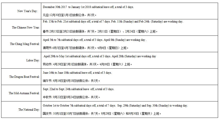 According to the State Council "to modify <New Year and National Day holiday approach> decision "in order to facilitate the various regions and departments as soon as possible and reasonable arrangements for holidays, tourism, transportation, production management and other related work, approved by the State Council, now the New Year’s Day 2018 Spring Festival, Ching Ming Festival, Labor Day, Dragon Boat Festival, Mid-Autumn Festival and National Day holiday off date notice of the specific arrangements as follows: