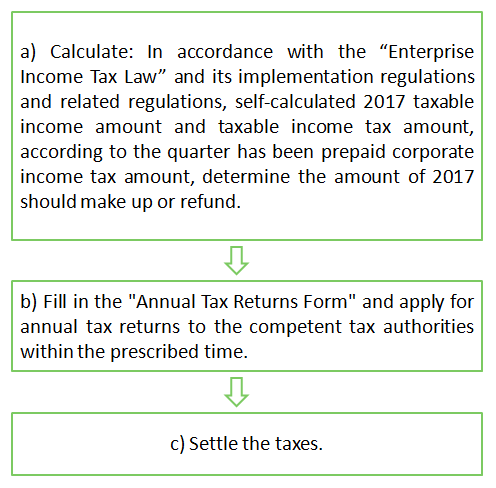 Article 54 of the “PRC Corporate Income Tax Law” stipulates that an enterprise shall submit annual corporate income tax returns to the tax authorities within five months from the end of the year, and make final settlements and settle the dues or tax refund should be paid. For example, the corporate income tax payment and settlement date for 2017 will be from January 1 to May 31 of 2018.