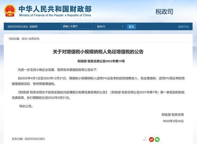 From April 1, 2022 to December 31, 2022, small-scale value-added tax taxpayers are subject to a 3% taxable sales income and are exempt from value-added tax; prepaid value-added tax items that are subject to a 3% pre-collection rate, Suspension of withholding VAT.